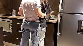 Wife fucked hard with tongue while washing dishes in the kitchen, getting her to cum before her stepmom gets home.