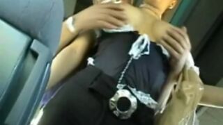 Young girl in sexy waitress outfit by old man on bus